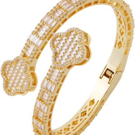 Iced Out 5A Cubic Zirconia Clover Lucky Bangle Bracelet For Men Women, Gold Plated Baguette Diamond Bracelets, Dainty Clover Bangle Bracelet with Spring Clasp