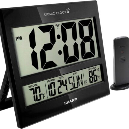 Sharp Atomic Clock – Never Needs Setting! – Jumbo 3″ Easy to Read Numbers – Indoor/Outdoor Temperature Display with Wireless Outdoor Sensor – Gloss Black