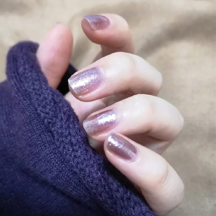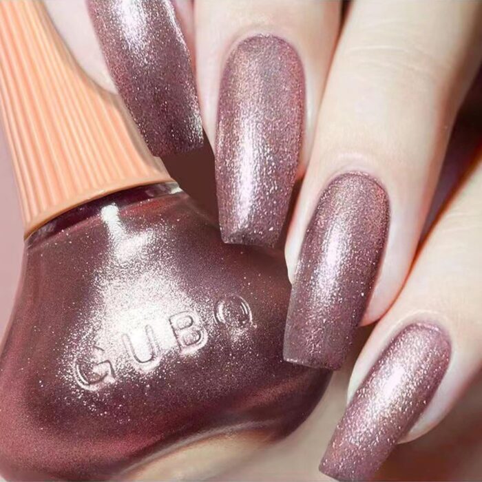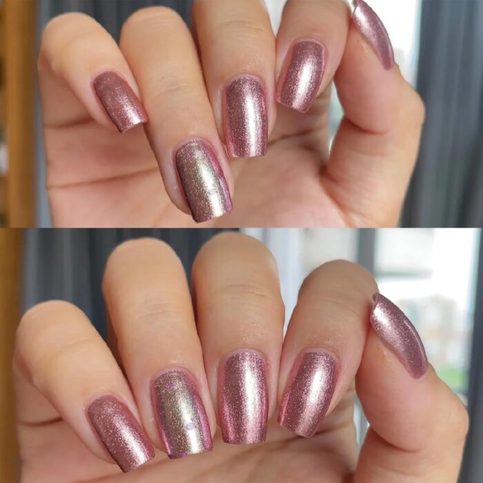Radiant Rose Gold Shimmer Nail Polish: Our luxurious rose gold is further enhanced by a vivid silver shimmer that effortlessly catches the light.