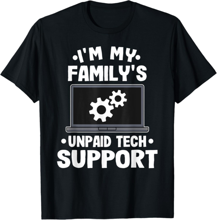 Are you the designated tech guru in your family? Show off your skills (and sense of humor) with this hilarious t-shirt. The “I’m My Family’s Unpaid Tech Support” design is perfect for computer engineers, IT professionals, and anyone who constantly finds themselves troubleshooting for their loved ones. Made from soft, comfortable fabric, this shirt is sure to become a favorite in your wardrobe. Whether you’re setting up WiFi, fixing a printer, or explaining the cloud for the millionth time, this shirt lets everyone know who to turn to for tech help. Get yours today and embrace your role as the unofficial IT department of your family!
