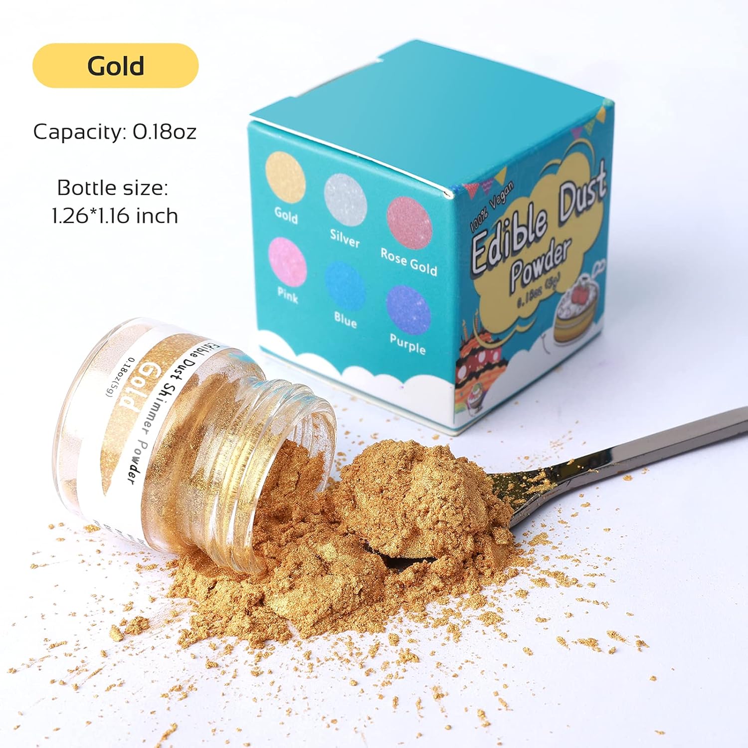 【12 Metallic Luster Dust Colors Are Available】Includes: Gold, silver, rose-gold, black, pink, blue, purple, red, white, burgundy, brown, green. 5 Grams Each Container