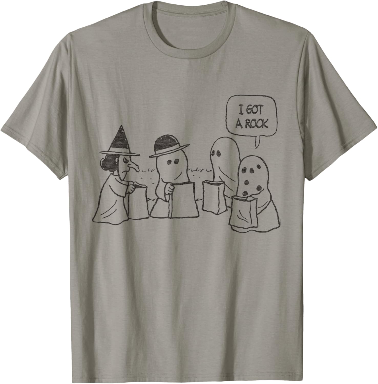Get into the Halloween spirit with this adorable Peanuts Charlie Brown “I got a rock” t-shirt! This classic design features Charlie Brown dressed in his ghost costume with the iconic phrase “I got a rock” printed on the front. Made from soft and comfortable material, this t-shirt is perfect for wearing to Halloween parties, pumpkin patches, or just lounging around. Show off your love for the Peanuts gang and celebrate Halloween in style with this fun and festive t-shirt.