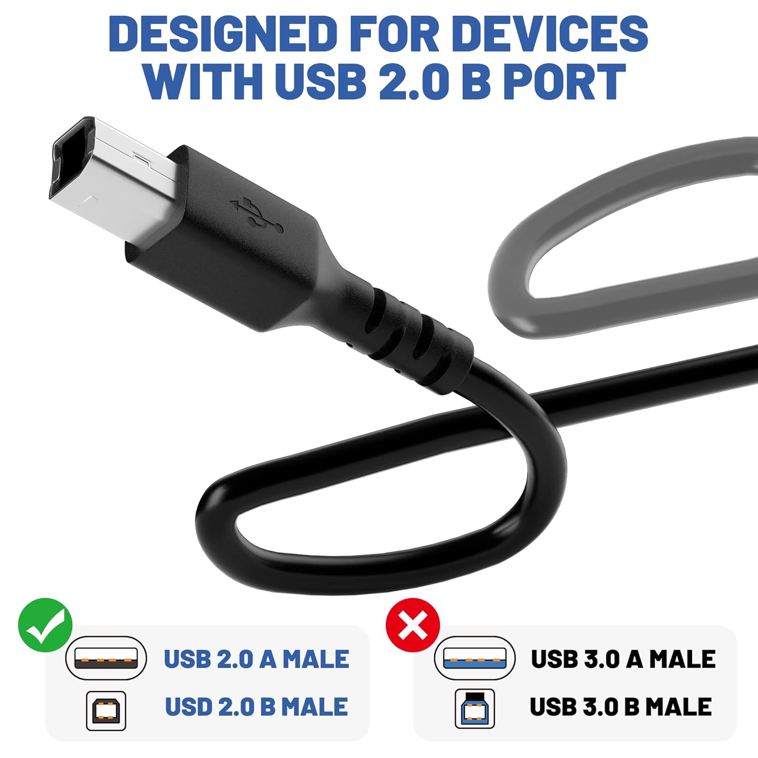 USB 2.0 A to B cable provides data transmission speed up to 480Mpbs. Backward compatible with USB 1.1, 1.0. For printing, scanning, file transfers, and device data syncing.